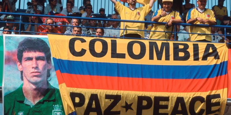 Suporter Kolombia membentangkan poster salah satu legenda mereka, Andres Escobar, yang tewas setelah mencetak gol bunuh saat melawan Amerika Serikat di penyisihan Grup A Piala Dunia 1994.Spirit