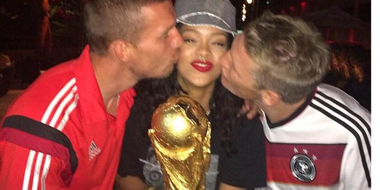 Rihanna memegang trofi Piala Dunia sementara itu Lucas Podolski dan Bastian Schweinsteiger menciumnya. Mereka terlibat dalam perayaan usai kemenangan 1-0 Jerman atas Argentina dalam laga final Piala Dunia 2014, Minggu (13/7/2014).Memang, setelah laga usai, para pemain Jerman langsung larut dalam euforia. Para kekasih dan istri mereka pun masuk ke lapangan. Pesta berlanjut dan beberapa pemain memperlihatkan keromantisan mereka bersama kekasih ataupun istrinya, seperti yang diperlihatkan Sami Khedira dengan Lena Gercke, Bastian Schweinsteiger dengan Sarah Brandner, Goetze dengan Ann-Kathrin Broemmel. Bahkan, Rihanna pun tak luput dari kecupan Lucas Podolski dan Schweinsteiger.