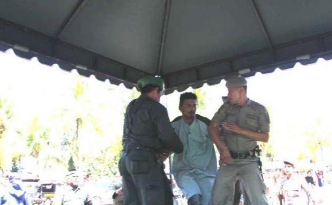 POS KUPANG.COM, PIDIE -- Algojo hukuman cambuk tunggang langgang dari panggung hukuman, setelah diamuk Syukri Ibrahim (41) terpidana perkara judi, yang semestinya mendapat hukuman cambuk di halaman Masjid Al Falah, Sigli, Aceh, Kamis (26/2/2015) sekira pukul 14.00 WIB.
