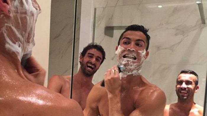 Ronaldo mengabadikan kegiatannya lewat kamera ponsel dan kemudian diunggah ke Instagram. Dalam foto tersebut, ia tampak sedang bercukur di kamar mandi sambil disaksikan kedua rekannya.