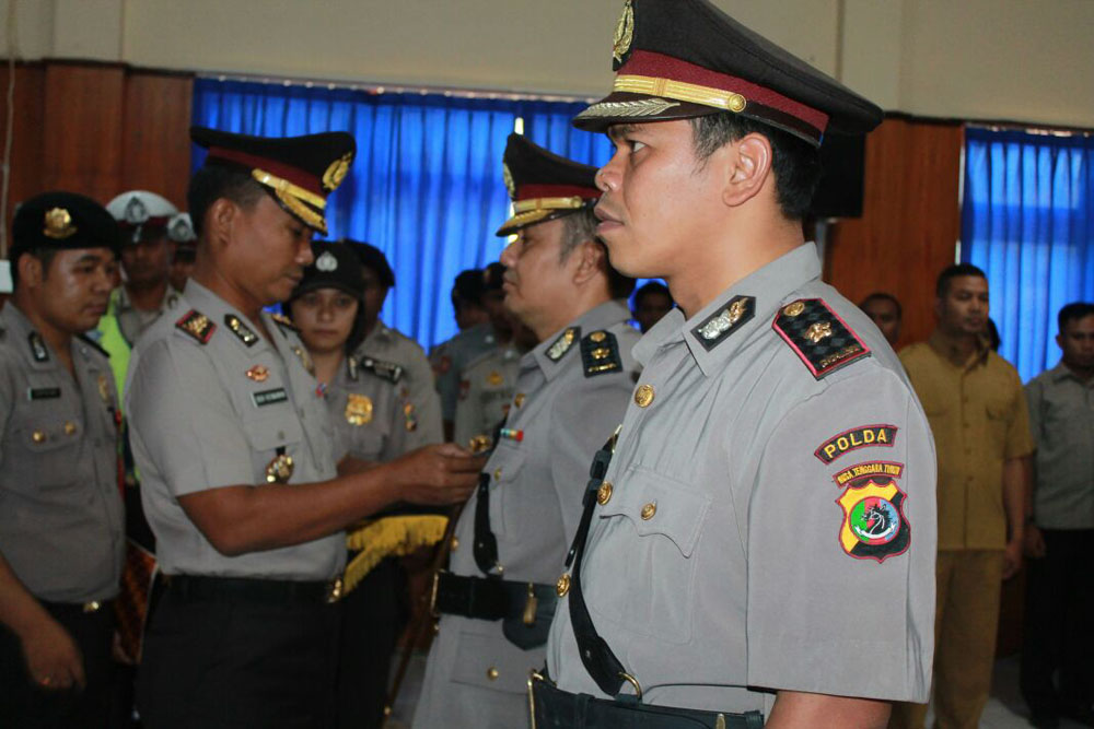 Kapolres Kupang Kota AKBP Budi Hermawan SIK menanggalkan tanda pangkat dan jabatan dari Kompol Dede Rochmana SH SIK saat serah terma jabatan Waka Polres Kupang Kota di aula lantai 2 polres Kupang Kota, Selasa (19/4/2016)