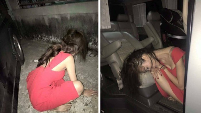 Dalam rangkaian foto itu, seorang wanita berpakaian merah terlihat mabuk sehingga tidak bisa lagi mengendalikan tindakannya sendiri.