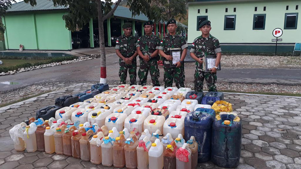 POS KUPANG.COM, ATAMBUA -- Anggota TNI dari Satuan Tugas (Satgas) Pengamanan Perbatasan (Pamtas) RI-RDTL di Pos Motaain, Desa Silawan, Kecamatan Tasifeto Timur (Tastim) berhasil menggagalkan upaya penyelundupan ribuan liter bahan bakar minyak (BBM) bersubsidi jenis minyak tanah dan solar di pesisir pantai Motaain, Minggu (2/7/2017) dini hari sekitar pukul 03.10 wita.