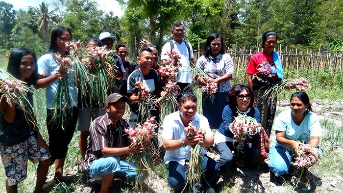 Robert Marut saat memanen bawang dengan istrinya merasa senang sebab meski di tengah kekeringan yang masih melanda wilayah Sumba Timur, Yayasan tersebut masih bisa memberikan percontohan kepada petani bawang sehingga masih bisa memanen bawang dan sayuran di tengah kekeringan panjang hanya dengan menggunakan pompa barsha tersebut.