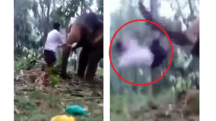 Bukannya berhasil menaiki gajah bak dalam film, remaja tersebut justru ditendang hingga terlempar beberapa meter.