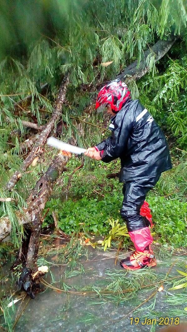 Dalam kondisi hujan, Marianus Sae langsung turun tangan. Ia memotong sendiri beberapa dahan pohon yang menghalangi jalan hingga bersih.