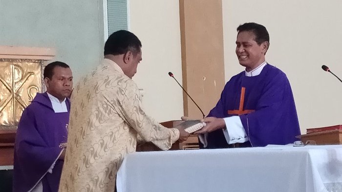 Pengukuhan BP LP3K Nagekeo ditandai dengan penyerahan Alkitab dari Uskup Agung Ende kepada Pengurus LP3K Nagekeo. (*)