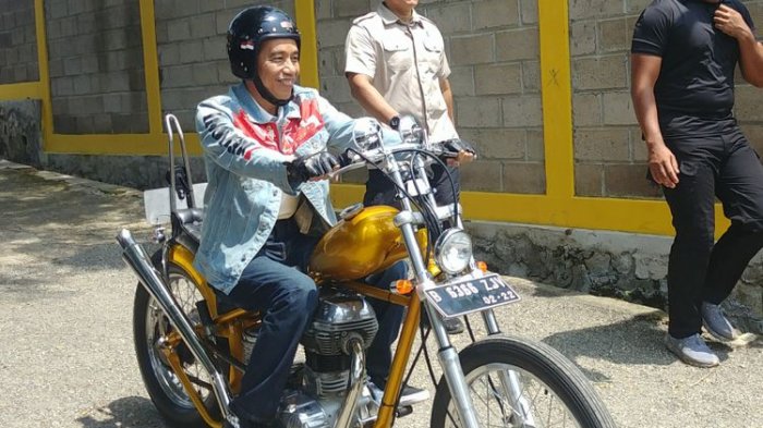 Jokowi menunggangi Motor Royal Enfield Bulltet 350 cc bergaya chooper.