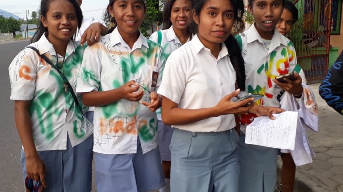 POS KUPANG.COM, LEWOLEBA - Anak-anak usia sekolah dasar (SD) di Lewoleba, Kabupaten Lembata, petang tadi menonton para siswa SMA melakukan aksi corat coret pakaian seragam sekolah.
