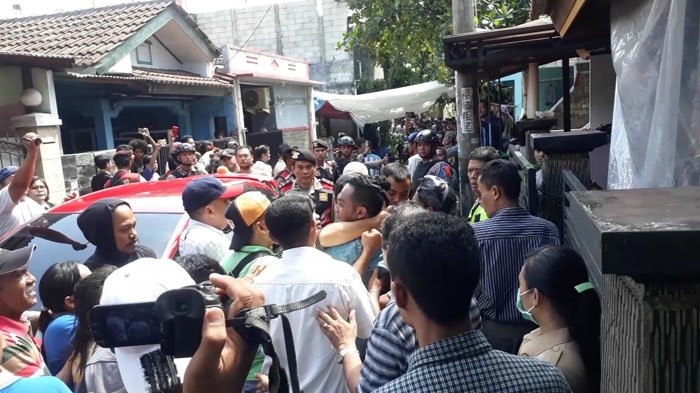 Tampak pria yang merupakan masih keluarga korban pun tetap memaksa ingi mendekat dan melihat dugaan pelaku.
