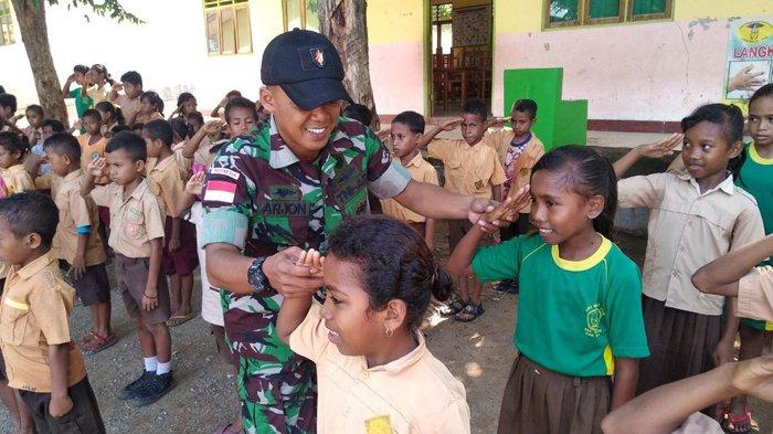 Anggota Pos Satgas Motaain yang berpakaian lengkap loreng tampak melatih anak-anak dengan gaya lebih lembut sehingga anak-anak tidak merasa takut.