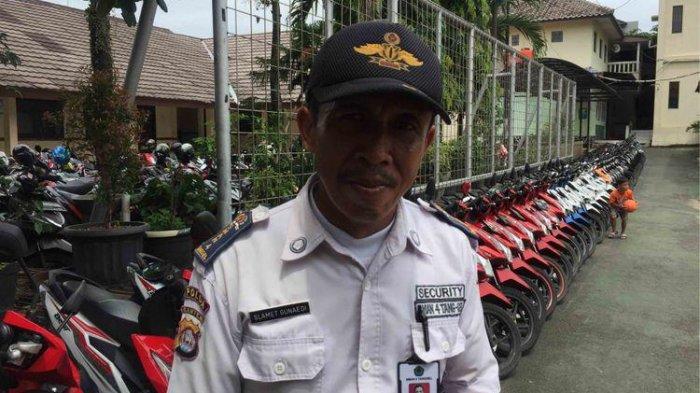 Pada video itu, Slamet tengah merapikan puluhan sepeda motor di parkiran sekolah dengan mengelompokkan sesuai warna dan merek motor.