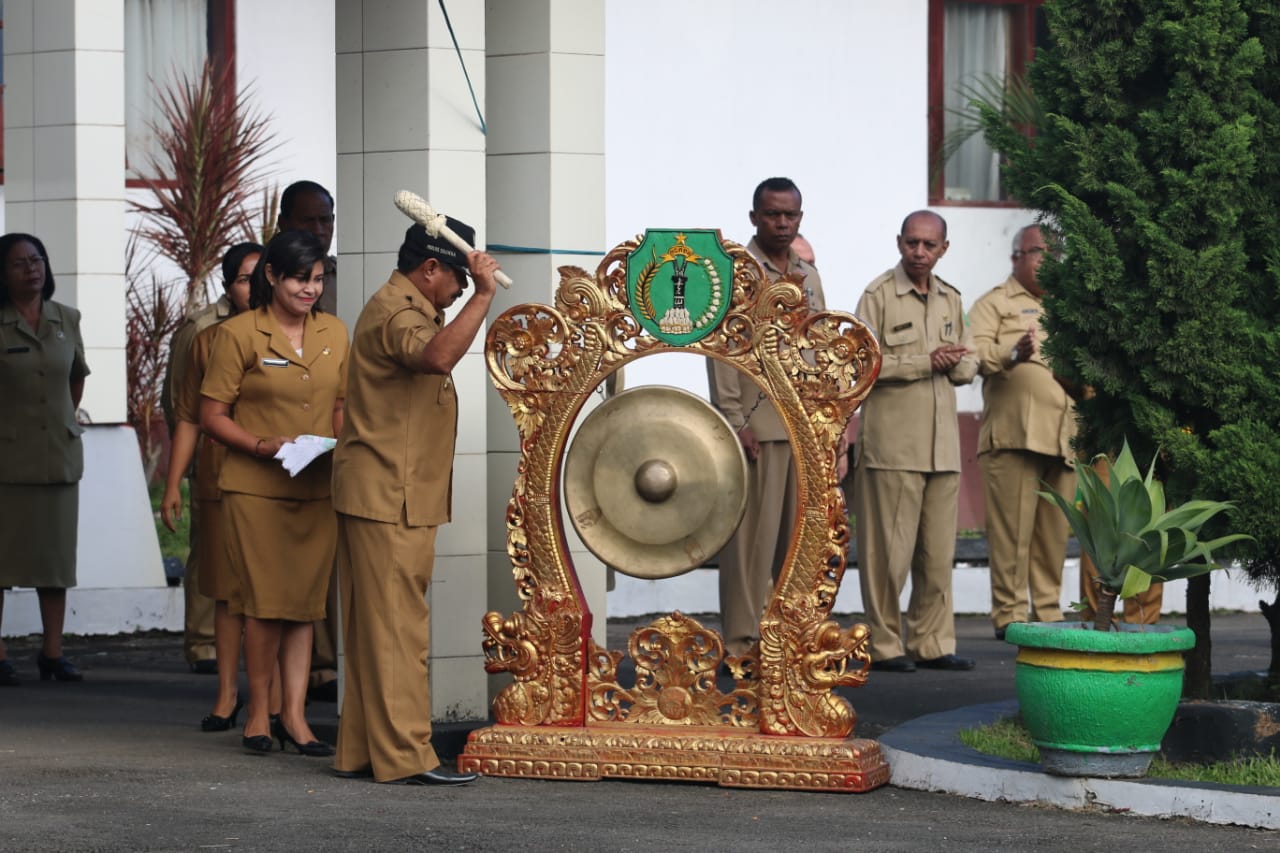 POS-KUPANG.COM | BAJAWA -- Plt. Bupati Ngada, Drs. Paulus Soliwoa, memimpin apel Pencanangan Bulan Bhakti Gotong Royong Masyarakat (BBGRM) di Halaman Kantor Bupati Ngada di Kota Bajawa, Senin (1/4/2019).