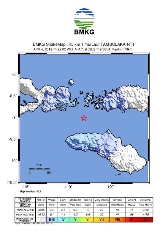 Gempa bumi tektonik berkekuatan 4.7 skala ricther (SR) mengguncang wilayah Tambolaka, Kabupaten Sumba Barat Daya, NTT, Kamis (4/4/2019) Sore.