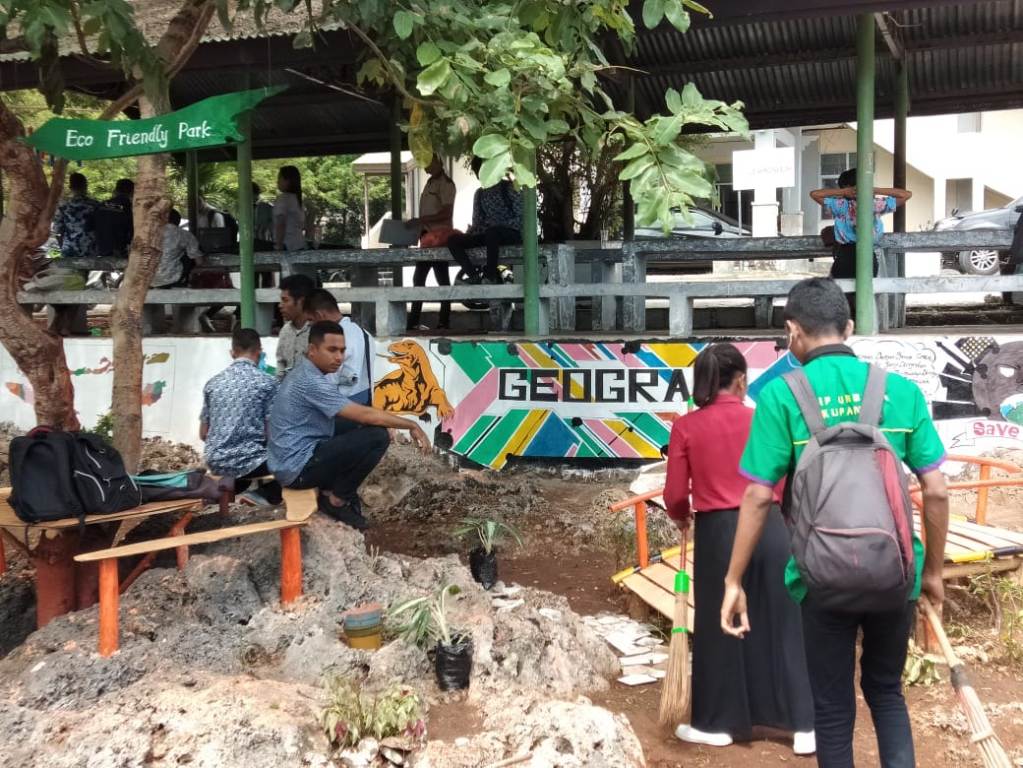 POS-KUPANG.COM|KUPANG - Mahasiswa Himpunan Jurusan (HMJ) Geografi, Fakultas Keguruan dan Ilmu Pendidikan (FKIP) Universitas Nusa Cendana (Undana) Kupang menyulap Tempat Pembuangan Sampah (TPS) menjadi lokasi yang asri, indah dan nyaman untuk belajar dan berdiskusi.