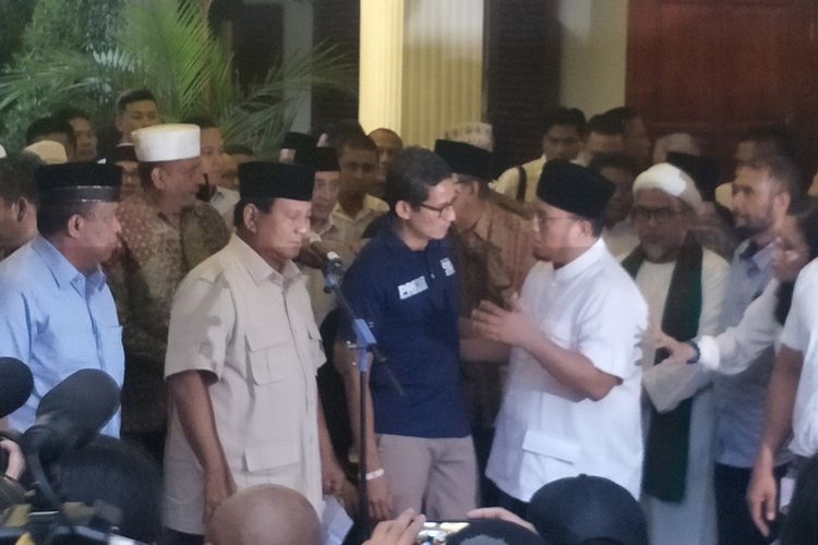Keduanya menggelar jumpa pers di kediaman Prabowo di Kertanegara, Jakarta, didampingi para pendukungnya. Prabowo dan Sandiaga bersama untuk pertama kali di hadapan publik pascapemungutan suara Pemilu 2019, Rabu (17/4/2019).