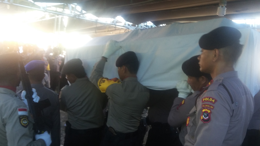 Anggota kepolisian dan TNI berdiri berbanjar kiri kanan ketika peti jenazah dibawa ke liang lahat di bagian belakang rumah almarhum. Istri almarhum bersama kedua anaknya juga kaum kerabat mengiringi dari belakang.