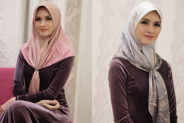 Nggak kalah modis, kali ini Donita terlihat tampil dengan gaya hijab model lilit berwarna maroon.