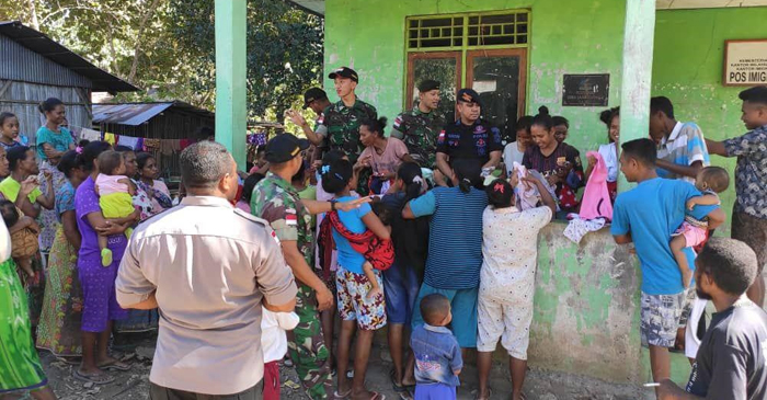 Kali ini, personel Satgas Pamtas Yonif Raider 408/Sbh Pos Delomi membagi-bagi pakaian layak pakai kepada masyarakat perbatasan yang berada di Dusun Delomil, Desa Lamaksenulu Kecamatan Lamaknen, Kabupaten Belu, NTT, Sabtu (1/6/2019).