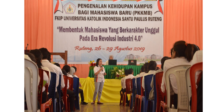 POS-KUPANG.COM | RUTENG - Mahasiswa baru FKIP Unika Santu Paulus Ruteng yang mengikuti PKKMB, Rabu (28/8/2019) pagi serius menyimak materi penyuluhan pola hidup sehat dan bebas narkoba serta HIV/AIDS yang disampaikan dokter Elisabeth E Ndori.
