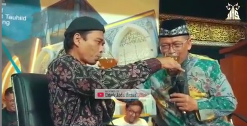Tak lama kemudian, Aa Gym atau KH Abdullah mengarahkan gelas minumannya ke mulut Ustadz Abdul Somad dan ia pun meminumnya.