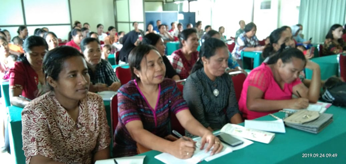 POS-KUPANG.COM | MAUMERE - Dialog tentang porsi dan kualitas makan bergizi bagi ibu hamil (Bumil) di Kabupaten Sikka dalam sosialisasi materi dan media KIE Prioritas Nasional, penuh gelak tawa Selasa (24/9/2019) siang di Aula Hotel Pelita, Kota Maumere, Pulau Flores.