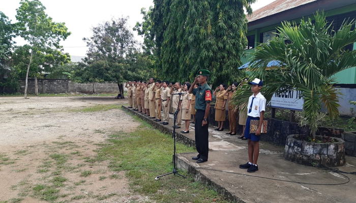 Di wilayah Koramil 1604-01/Kota Kupang, Babinsa Sertu Cristovao Lopes dan Sertu Leo Azhari memimpin upacara bendera di SMPN 10 Kota Kupang RT. 033 Jalan Prof. Dr. Herman Johannes, Lasiana, Kecamatan Kelapa Lima, Kota Kupang Provinsi Nusa Tenggara Timur pada Senin (10-2-2020).