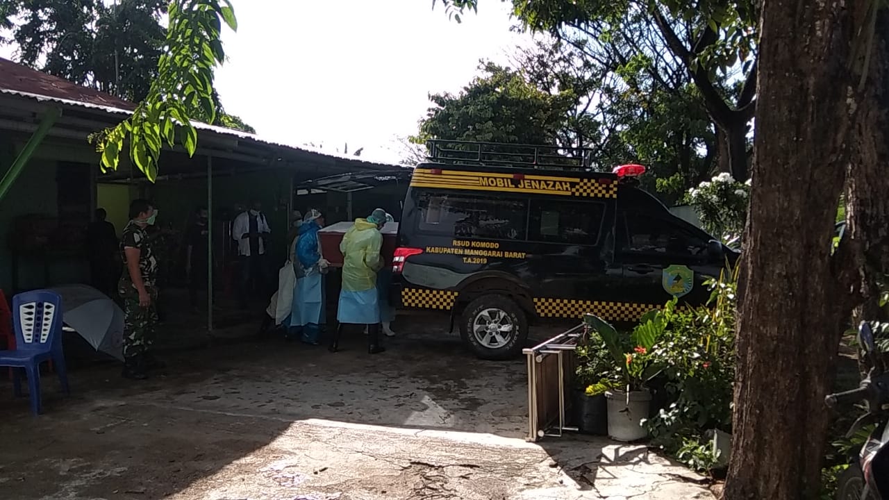 INW dibawa ke rumah duka di Kecamatan Komodo. Di rumah duka, jenazah INW dibawa keluar oleh sejumlah petugas yang mengenakan Alat Pelindung Diri (APD) pukul 15.53 Wita.