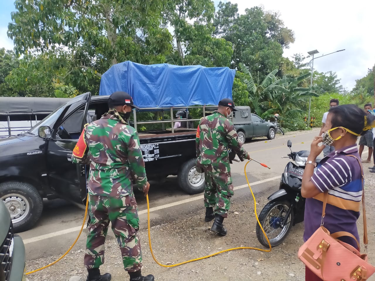 Redam Kepanikan Warga, Tentara Semprot Disinfektan di Jalur Kefa-Napan dan Kefa- Wini Lawan Covid-19
