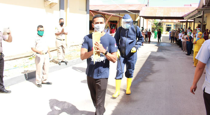 Suasana haru nampak mengiringi pelepasan mereka. Satu persatu mereka mengambil map yang berisi surat tanda bebas Covid-19 dari Kabiddokes yang berdiri di bagian tengah pagar betis.
