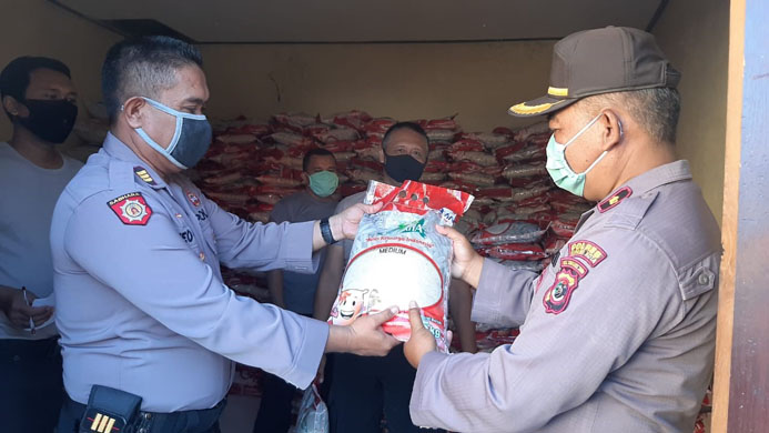 Penyerahan secara simbolis bantuan sosial tersebut, urai Kompol I Ketut Saba, antara lain: 5 Kilogram beras sebanyak 1414 paket.