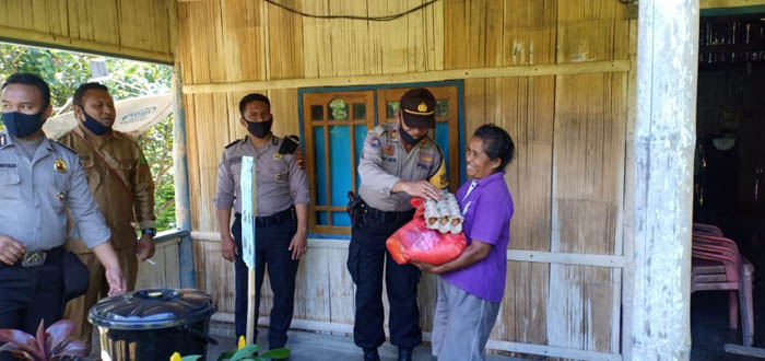 POS-KUPANG.COM | BAJAWA - Kasat Binmas Polres Ngada AKP Oktofinaus P. Abor bersama sejumlah anggota menyerahkan bantuan Sembako kepada sejumlah warga kurang mampu, di Desa Sarasedu Kecamatan Golewa Kabupaten Ngada, Kamis (11/6/2020).