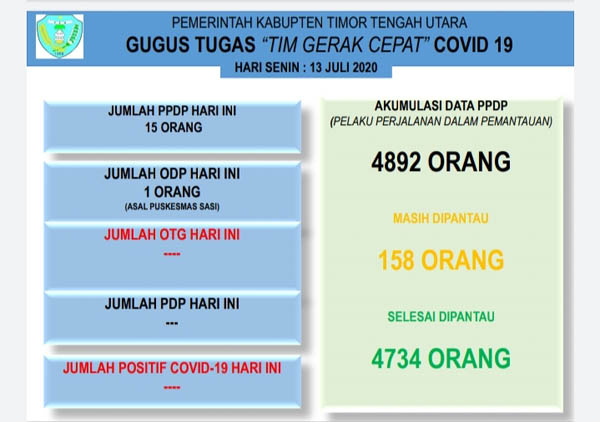 Jika sebelumnya, Minggu (12/7/2020) sekira pukul 21:34 Wita, jumlah PPDP di Kabupaten TTU sebanyak 4.877 orang, maka pada, Senin (13/7/2020), jumlah PPDP di TTU bertambah 15 orang sehingga menjadi 4.892 orang.