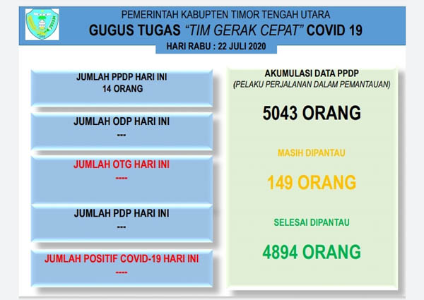 Jika sebelumnya, Selasa (21/7/2020) sekira pukul 18:06 Wita, jumlah PPDP di Kabupaten TTU sebanyak 5.029 orang, maka pada, Rabu (22/7/2020), jumlah PPDP di TTU bertambah 14 orang sehingga menjadi 5.043 orang.