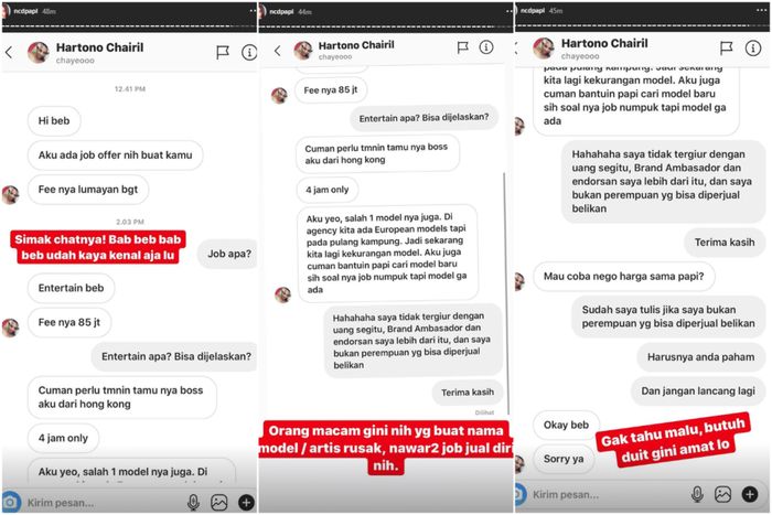 "Hahahahaha saya tidak tergiur dengan uang segitu, Brand Ambassador dan endorsan saya lebih dari itu, dan saya bukan perempuan yang bisa diperjual belikan," isi salah satu balasan Nora.