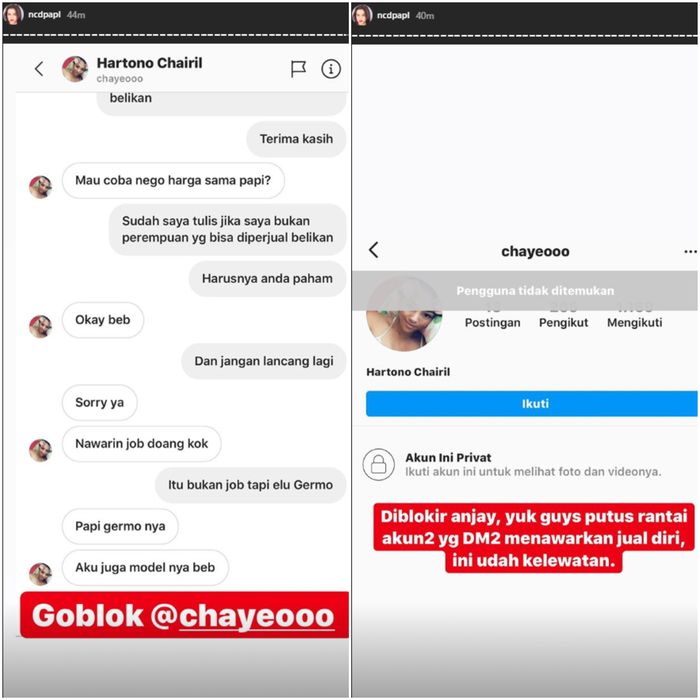"Diblokir anjay, yuk guys putus rantai akun2 yg DM2 menawarkan jual diri, ini udah kelewatan," pungkasnya.*