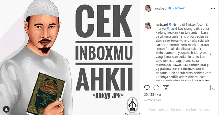 “Nemu di Twitter foto ini, intinya @jrxsid kau orang baik, cuma kadang ketikan kau tuh lantam benar,” tulisnya dalam sebuah keterangan dikutip Grid.ID, Selasa (11/8/2020).
