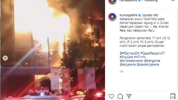 Diketahui, petugas pemadam kebakaran terus berupaya memadamkan api yang melalap gedung di Kompleks Kejaksaan Agung RI, Jalan Sultan Hasanuddin Dalam, Kramat Pela, Kebayoran Baru, Jakarta Selatan, Sabtu (22/8/2020).