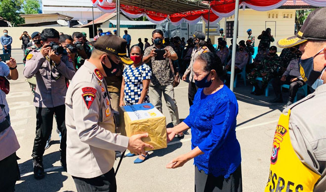 POS-KUPANG.COM | ATAMBUA - Kapolda NTT, Irjen (Pol) Lotharia Latif bersama Dandrem 161/WS Kupang, Brigjen TNI Samuel Petrus Hehakaya menyerahkan bantuan kepada warga kurang mampu yang terdampak Covid-19 di Kabupaten Belu, daerah Perbatasan RI-RDTL.
