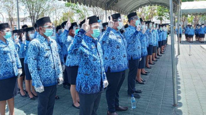 Ratusan PNS yang diambil sumpahnya menggunakan seragam Korpri dan memakai masker sekaligus face shiled di lapangan upacara Kantor Wali Kota Kupang.