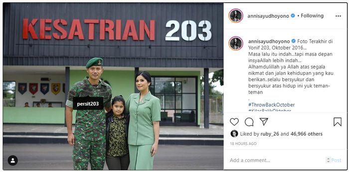 "Foto Terakhir di Yonif 203, Oktober 2016...," tulis @annisayudhoyono mengawali keterangan dalam postingannya.
