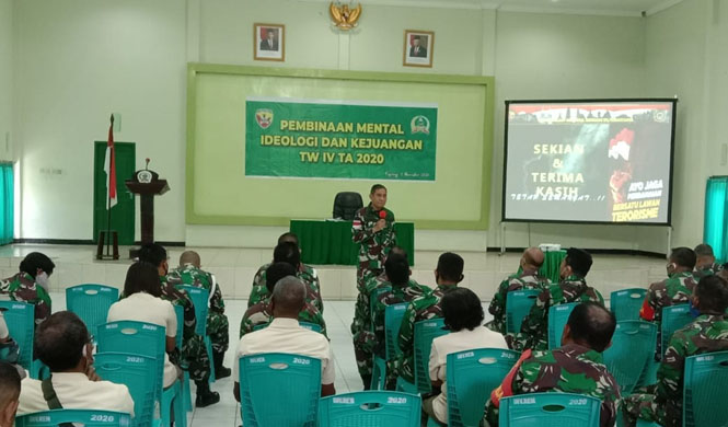 Hal tersebut disampaikan oleh Danrem 161/Wira Sakti Brigjen TNI Samuel Petrus Hehakaya dalam sambutan tertulis yang dibacakan oleh Kasi Pers Kasrem 161/Wira Sakti Kol. Caj Drs. Tulu Christian I Bengngu pada kegiatan Pembinaan Mental Ideologi dan Kejuangan bagi Prajurit dan PNS Korem 161/Wira Sakti TW IV TA 2020, Senin (9/11/2020) di Aula Sudirman Makorem 161/Wira Sakti.