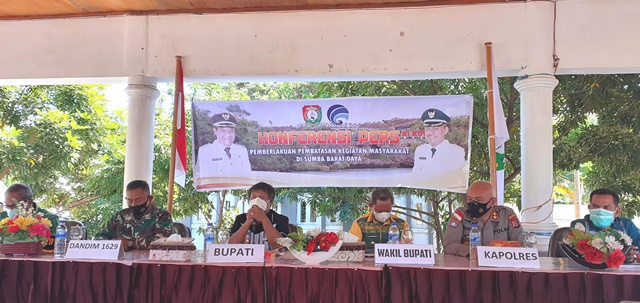 Foto Bupati SBD, Kornelius Kodi Mete bersama Wakil Bupati Bupati Marthen Christian Taka, S.IP, Pelaksana Sekda SBD, Bernadus Bulu, Kepala Dinas Kominfo SBD, drh.A.Praing, Kepala Dinas Kesehatan SBD, drg.Yulianus Kaleka, Kapolres SBD, AKBP Joseph F.Mandagi dan Dandim 1629 SBD dalam hal ini diwakili Kasdim Mayor Sunoko menggelar jumpa pers tentang pemberlakuan PPKM yang berlangsung di lopo rumah jabatan bupati SBD, Kamis 15 Juli 2021 *)