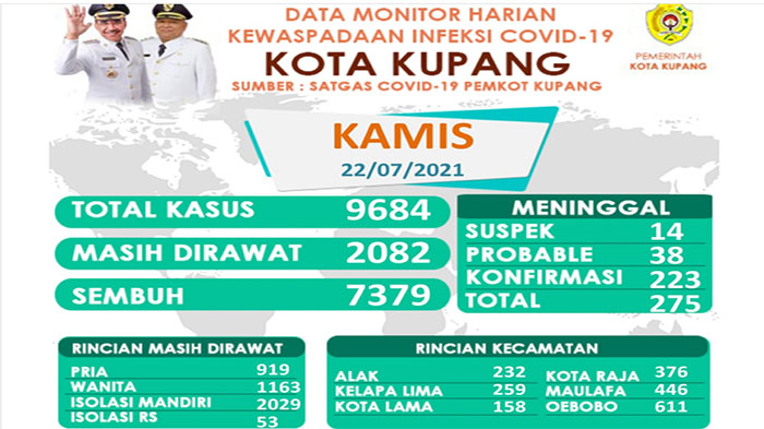 Dikutip dari kupangkota.go.id , pada pada Rabu 21 Juli 2020 tercatat kasus sebanyak 9555 dan pada Kamis 22 Juli 2021 sudah menjadi 9.486 atau naik 129 kasus