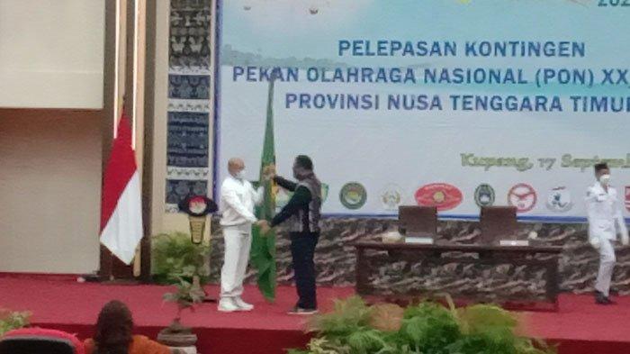 Gubernur NTT, Viktor Bungtilu Laiskodat saat itu menyerahkan bendera kepada Wakil Gubernur NTT selaku Ketua Kontingen.