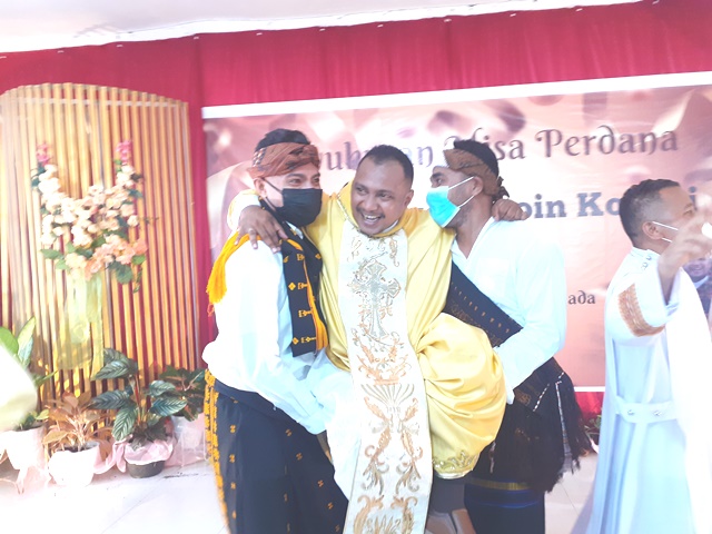 Suasana yang sungguh meriah ditunjukkan oleh Umat Paroki Santu Fransiskus dari Asisi, Kolhua, Kupang, Keuskupan Agung Kupang, usai misa perdana Romo