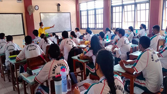 POS-KUPANG.COM, KUPANG - Tim dari Institut Teknologi Nasional Malang ( ITN Malang), Sudiro dan Hadi memberikan sosialisasi bagi para pelajar SMAK Giovanni Kupang, Selasa 8 Februari 2022.