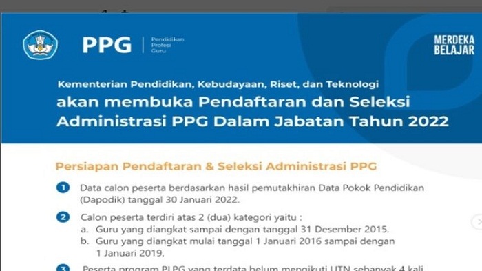 Pendaftaran program Pendidikan Profesi Guru (PPG) Dalam Jabatan Tahun 2022 telah resmi dibuka mulai 12-25 Februari 2022.