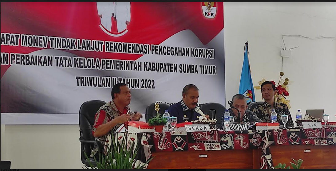 Hal tersebut menjadi catatan penting yang diungkapkan Bupati Sumba Timur Drs Khristofel Praing kepada Komisi Pemberantasan Korupsi ( KPK ) saat Rapat Monev Tindak Lanjut Rekomendasi Pencegahan Korupsi dan Perbaikan Tata Kelola Pemerintah Kabupaten Sumba Timur Triwulan II Tahun 2022 di Aula Setda Sumba Timur, Jumat 24 Juni 2022 pagi.
