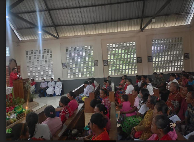 POS-KUPANG.COM, KUPANG - Umat di Desa Silu Kabupaten Kupang mensyukuri hasil panen dengan mempersembahkannya pada perayaan ekaristi sekaligus merayakan pesta pelindung Gereja Stasi St Petrus Nunsena, Rabu 30 Juni 2022.